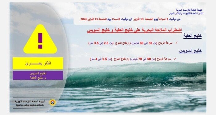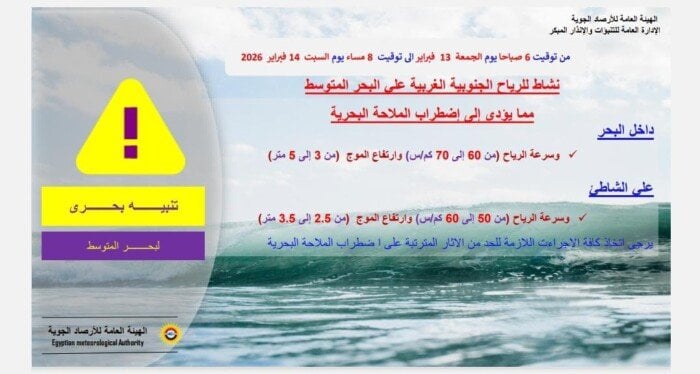 تحذيرات الأرصاد الجوية عن رياح مثيرة واضطراب بالملاحة اليوم الجمعة 13 فبراير 2026