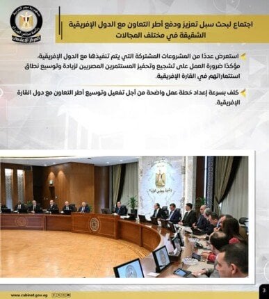 عقد رئيس الوزراء اجتماعًا لبحث سبل تعزيز التعاون مع الدول الإفريقية في مختلف المجالات. وتم خلال الاجتماع استعراض مشروعات مشتركة مع هذه الدول، مع التأكيد على أهمية تشجيع المستثمرين المصريين لزيادة استثماراتهم في القارة الإفريقية وطالب بسرعة إعداد خطة عمل لتفعيل التعاون.