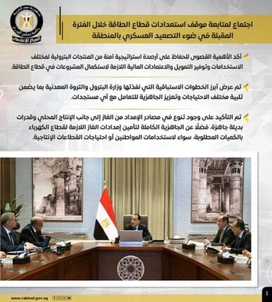 عقد رئيس الوزراء اجتماعًا لمتابعة استعدادات قطاع الطاقة في ظل التصعيد العسكري في المنطقة. وأكد على أهمية الحفاظ على أرصدة استراتيجية آمنة من المنتجات البترولية لمختلف الاستخدامات، بالإضافة إلى توفير التمويل والاعتمادات المالية اللازمة لاستكمال مشروعات الطاقة.