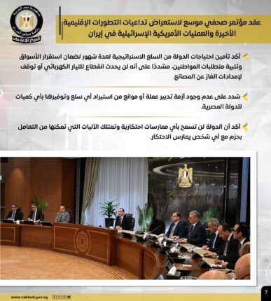 عقد رئيس الوزراء مؤتمرًا صحفيًا موسعًا لاستعراض تداعيات التطورات الإقليمية الأخيرة، مؤكدًا تأمين احتياجات الدولة من السلع الاستراتيجية لفترة طويلة. وطمأن المواطنين بأن الدولة لن تسمح بانقطاع الكهرباء أو نقص إمدادات الغاز للمصانع، كما ستعمل على توفير السلع بالكمية المطلوبة.