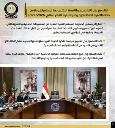 التقى رئيس الوزراء مع وزير التخطيط والتنمية الاقتصادية لاستعراض ملامح خطة التنمية الاقتصادية والاجتماعية للعام المالي 2026-2027. وأشار إلى سعي الحكومة المستمر لتنفيذ مشروعات خدمية وتنموية تهدف إلى تحسين مستوى الخدمات المقدمة للمواطنين، خاصة في قطاعي الصحة والتعليم.