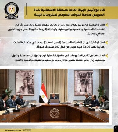 التقى رئيس الوزراء رئيس الهيئة العامة للمنطقة الاقتصادية لقناة السويس لمتابعة مشروعات الهيئة، حيث أشار إلى تنفيذ 378 مشروعًا من يوليو 2022 حتى فبراير 2026. كما تم استعراض نجاح المنطقة الصناعية (العين السخنة) في جذب استثمارات وصلت إلى 33.06 مليار دولار من خلال 547 مشروعًا متنوعًا.