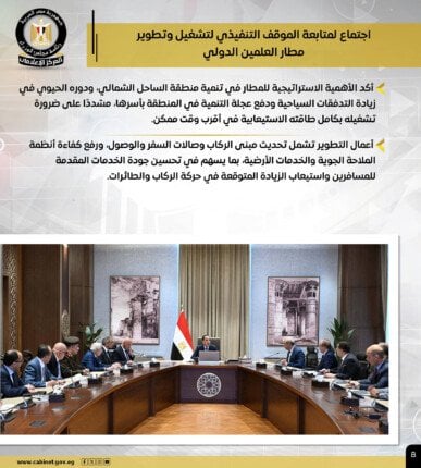 كما أكد على أهمية تشغيل مطار العلمين الدولي واستغلاله بكامل طاقته الاستيعابية، لتعزيز التنمية في منطقة الساحل الشمالي.