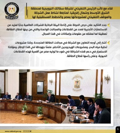 التقى رئيس الوزراء نائب الرئيس التنفيذي لشركة سكاتك النرويجية لمتابعة أنشطة الشركة ومشروعاتها في مصر. وأكد مجددًا على حرص الدولة على تقديم بيئة جاذبة للاستثمار، خصوصًا في قطاع الطاقة.
